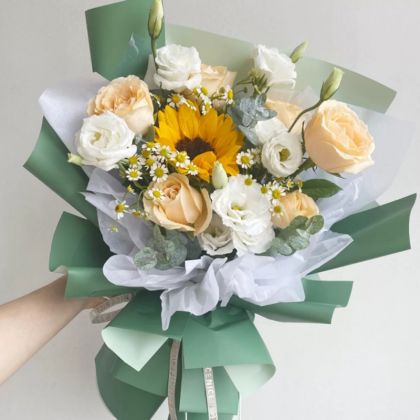 【花材】:向日葵1枝,香槟玫瑰6枝,白色洋桔梗,洋甘菊,尤加利搭配。 【包装】:白色雪梨纸,绿色欧雅纸包装,灰色丝带装饰。