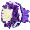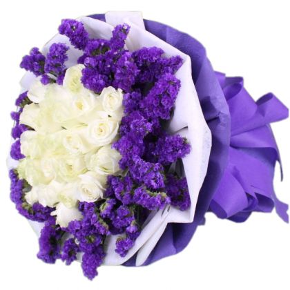 [材料]:24枝白玫瑰,勿忘我搭配。 [包装]:白色棉纸内衬,紫色手揉纸圆形包装,紫色纸带束扎。