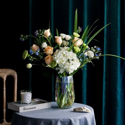 家养鲜花--白绣球香槟玫瑰绿色康乃馨 到店取