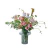 粉玫瑰5枝,马蹄莲1枝,粉康乃馨6枝,绣珠,小菊,绿叶。
