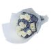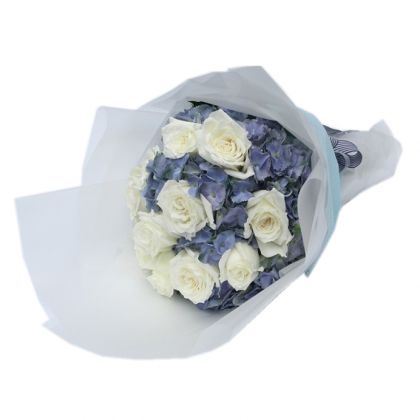 [材料]:11枝白玫瑰,蓝色绣球搭配。 [包装]:乳白色雾面纸精美包装,蓝色蝴蝶结束扎。