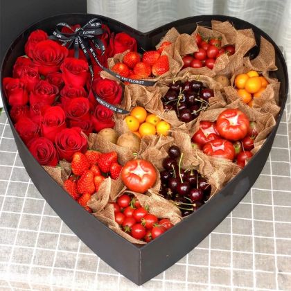 红玫瑰24枝。草莓,圣女果,猕猴桃,车厘子,莲雾,金桔