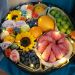 【花材】:紫玫瑰4枝,粉玫瑰1枝,黄玫瑰1枝,香槟玫瑰1枝,橘色玫瑰6枝,向日葵2枝,洋桔梗尤加利蓝色满天星搭配 【水果】:桔子,脐橙,蓝莓,柚子,玫瑰葡萄 【包装】:黑色圆形礼盒,铜丝灯装饰 备注:如部分水果因季节缺货,选用当季时令水果代替。