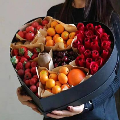【花材】:红玫瑰19枝 【水果】:圣女果,金桔,脐橙,猕猴桃,草莓,山楂,车厘子 【包装】:黑色心形礼盒 备注:如部分水果因季节缺货,选用当季时令水果代替。