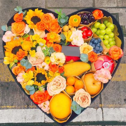 向日葵3枝,香槟玫瑰4枝,多头玫瑰,粉色洋桔梗,尤加利搭配;车厘子,玫瑰葡萄,圣女果,蓝莓,苹果,丰