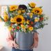 【花材】:向日葵5枝,黄玫瑰11枝,橙色多头玫瑰5枝,蓝色绣球1枝,麦秆菊、白色洋桔梗,尤加利搭配。 【包装】:灰色抱抱桶礼盒定制。
