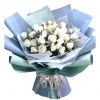 [材料]:33枝白玫瑰,黄金球,银叶菊搭配。 [包装]:白色雪梨纸内衬,蓝绿色琅青纸扇形包装,白