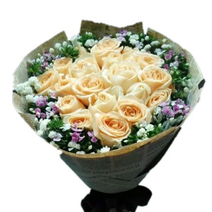 [材料]:19枝香槟玫瑰,白色相思梅围绕。 [包装]:英文报圆形精美包装,咖啡色棉带花结束扎。