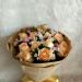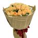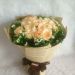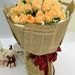 [材料]:18枝香槟玫瑰,雏菊,黄莺和莽叶点缀。 [包装]:英文报纸圆形包装,咖啡色缎带蝴蝶结装饰