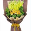 [材料]:9枝香槟玫瑰,7枝黄色金鱼草,巴西页卷边围绕,白色雏菊和绿叶点缀 [包装]:粉色和米色皱