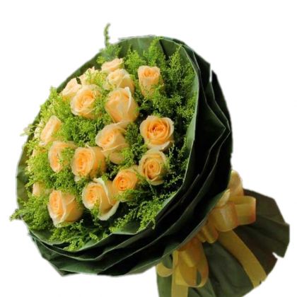 [材料]:19枝香槟玫瑰,黄英丰满。 [包装]:绿色瓦楞纸多层精美包装,香槟色花结束扎。