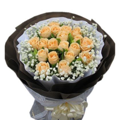 [材料]:19枝香槟玫瑰,绿叶搭配,满天星围绕。 [包装]:白色瓦楞纸内衬,咖啡色瓦楞纸圆形精美包
