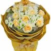 [材料]:11枝香槟玫瑰,白色小雏菊搭配 [包装]:黄色瓦楞纸多层圆形精美包装,香槟色丝带蝴蝶结