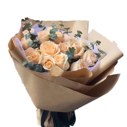 [材料]:19枝香槟玫瑰,尤加利搭配。 [包装]:牛皮纸圆形精美包装,黑色丝带花结束扎。