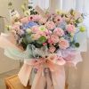 粉玫瑰9枝,蓝色绣球2枝,粉色小雏菊2枝,多头玫瑰1枝,非洲菊4枝,粉康乃馨3枝,白色洋桔梗,尤加利