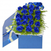 材料:19枝蓝玫瑰,黄英搭配。 包装:白色网片托底,长形礼盒精美包装(礼盒颜色随机)。