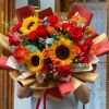 向日葵3枝,红玫瑰5枝,红色康乃馨8枝,多头玫瑰3枝,红豆,尤加利搭配