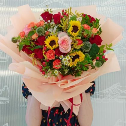 向日葵3枝,红玫瑰9枝,粉玫瑰2枝,多头玫瑰3枝,红豆,洋甘菊,刺琴搭配