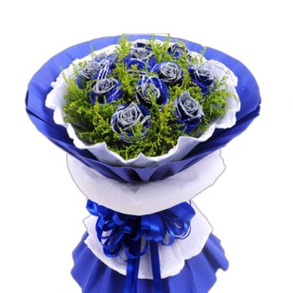 [材料]:11枝蓝色妖姬,黄英丰满。 [包装]:蓝色纱网包花头,白色卷边纸内衬,蓝色瓦楞纸外围,圆