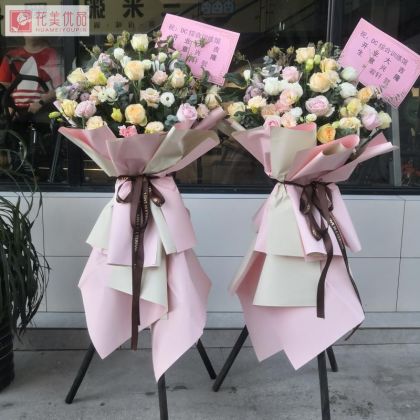香槟玫瑰粉雪山玫瑰洋桔梗尤加利乒乓菊,三脚架花篮