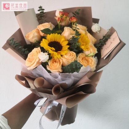 香槟玫瑰11枝,向日葵2枝,尤加利,多头玫瑰,洋桔梗搭配,精美花束。