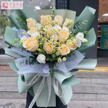 11枝香槟玫瑰洋桔梗尤加利麦秆菊花束