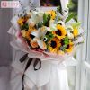 向日葵5枝,多头香水百合2枝,香槟玫瑰11枝,小雏菊尤加利混搭花束