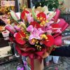 大红掌6枝,多头粉色百合4枝,苏醒玫瑰6枝,跳舞兰半包,精美花束。