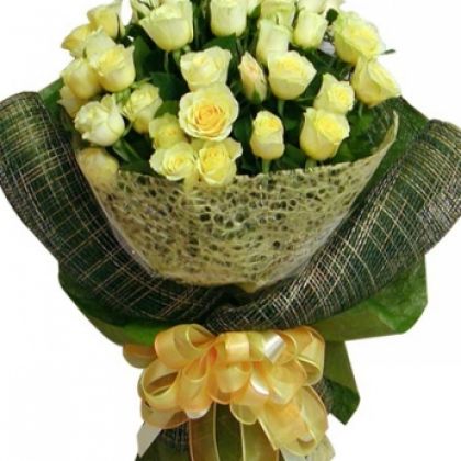 [材料]:33枝黄玫瑰 [包装]:米色玻璃纸内衬,深绿色麻片外围,绿色皱纹纸托底,香槟色纱带花结束