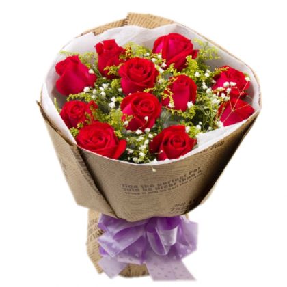 [材料]:11枝红玫瑰,黄英丰满,满天星点缀。 [包装]:白色棉纸内衬,英文报圆形精美包装,淡紫色