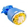 材料:12枝黄玫瑰,7枝白玫瑰。 包装:玻璃纸 白色棉纸内衬,蓝色手揉纸圆形精美包装,蓝色丝带束扎。