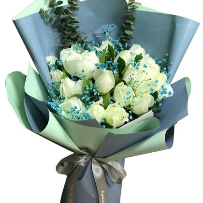 [材料]:21枝白玫瑰,尤加利,蓝色满天星搭配。 [包装]:蓝+绿色琅青纸扇形包装,银色丝带蝴蝶结