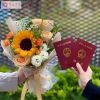 结婚领证颁证仪式小花束,向日葵1枝,香槟玫瑰3枝,白色洋桔梗1枝,多头泡泡2枝,洋甘菊,尤加利,喷泉