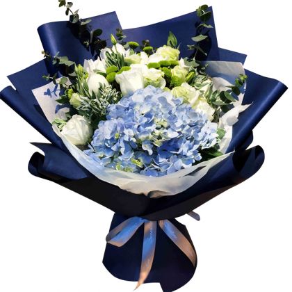 [材料]:11枝白玫瑰,蓝色绣球2枝,绿色雏菊,洋桔梗,尤加利搭配。 [包装]:白色雪梨纸内衬,宝