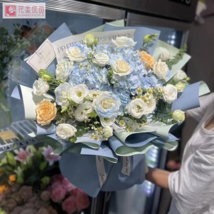 绣球1枝,香槟玫瑰白玫瑰19枝,洋桔梗洋甘菊尤加利搭配,天蓝色精美包装。