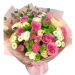 [材料]:11枝苏醒玫瑰,2枝香槟玫瑰,6枝白玫瑰,绿、白雏菊,小叶尤加利点缀。