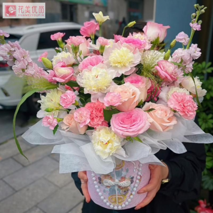 粉色紫罗兰2枝,白色芍药8枝,香槟玫瑰4枝,艾莎玫瑰5枝,粉色康乃馨3枝,多头康乃馨,喷泉草2枝,洋