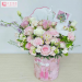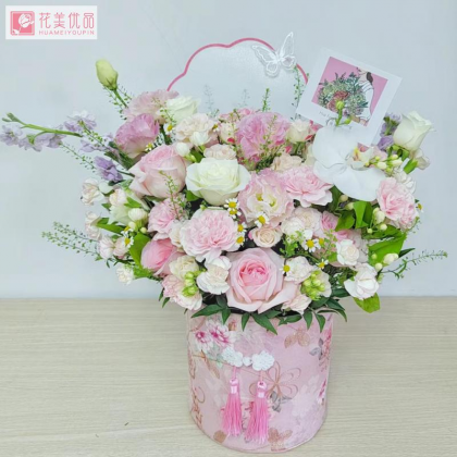 花材:粉雪山5枝,白玫瑰6枝,白色蝴蝶兰1朵粉色康乃馨,多头康乃馨,绿灵草,洋甘菊,洋桔梗,茉莉花搭配。 包装:抱抱桶(款式随机)花泥插花。