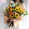 花材:向日葵8枝,火灵鸟玫瑰8枝,苹果尤加利叶搭配。 包装:雪梨纸内衬,香槟色多层包装,黑色缎带蝴蝶