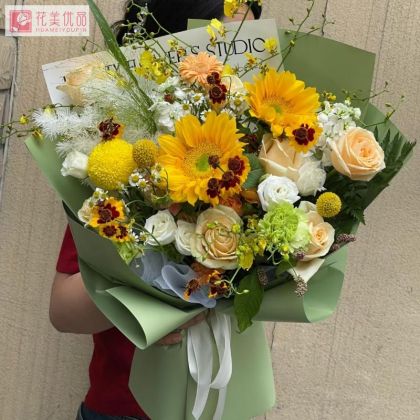 花材:绿芯向日葵2枝,白色紫罗兰2枝,跳舞兰3枝,香槟玫瑰6枝,黄色乒乓菊1枝,黄金球2枝,绿色康乃