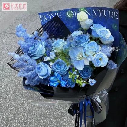 花材:碎冰蓝玫瑰11枝,白色蝴蝶兰1朵,蓝色蓬莱松,蓝色郁金香1枝,喷泉草,蓝星花搭配。 包装:蓝色
