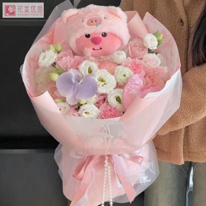 花材:露比公仔1个,粉雪山玫瑰6枝,粉色康乃馨9枝,粉掌1枝,蝴蝶兰1朵,白色洋桔梗,喷泉草搭配。