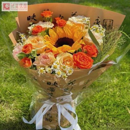花材:向日葵1枝,香槟玫瑰5枝,橙色芭比3枝,喷泉草1枝,洋甘菊搭配。 包装:毛笔字牛皮纸包装,蝴蝶结装饰。