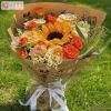 花材:向日葵1枝,香槟玫瑰5枝,橙色芭比3枝,喷泉草1枝,洋甘菊搭配。 包装:毛笔字牛皮纸包装,蝴蝶