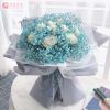 花材:白玫瑰11枝,蓝色满天星丰满。 包装:白色牛奶棉内衬,灰色欧雅纸多层圆形包装,白色字母带蝴蝶结