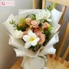 花材:卡布奇诺玫瑰8枝,白色郁金香2枝,翠珠,风铃草,喷泉草搭配。 包装:白色包装。