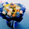 花材:向日葵3枝,香槟玫瑰11枝,橙色芭比,蓝星花,喷泉草,尤加利叶搭配。 包装:白色牛奶棉内衬,宝