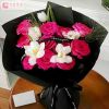 花材:弗洛伊德玫瑰11枝,白色郁金香5枝,喷泉草2枝。 包装:黑色包装,黑色字母带蝴蝶结。