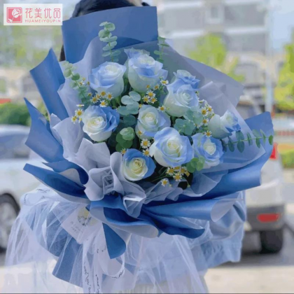 花材:碎冰蓝玫瑰11枝,洋甘菊,尤加利叶搭配。 包装:白色牛奶棉内衬,蓝色外包装,白色仙女纱白色蝴蝶结装饰。