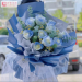 花材:碎冰蓝玫瑰11枝,洋甘菊,尤加利叶搭配。 包装:白色牛奶棉内衬,蓝色外包装,白色仙女纱白色蝴蝶